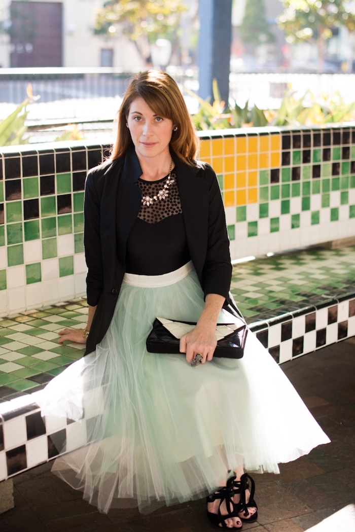 Tüllkleid inspiration mintgrüne idee für rock kombiniert mit schwarzer satinbluse mit spitze und schwarz weiße accessoires