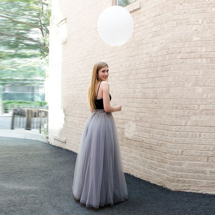 Tutu rock damen richtig stylen langes graues kleid schwarzer top blonde dame roter lppenstift ideen
