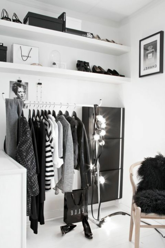 Ankleidezimmer kleiner raum schwarz weiss chanel tuete