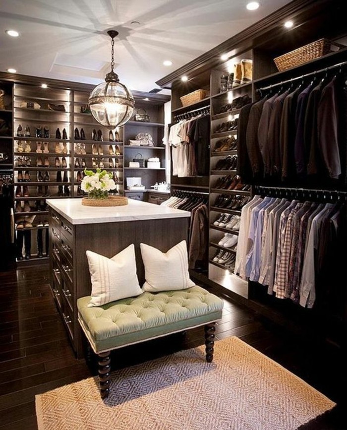 Offene kleiderschraenke hocker gruen weisse kissen ankleidezimmer