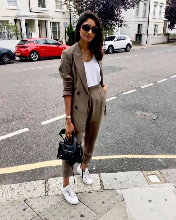 schwarze sneakers schwarze jeans camelfarbener mantel schwarze mini handtasche dresscode sportlich elegante outfits damen 1