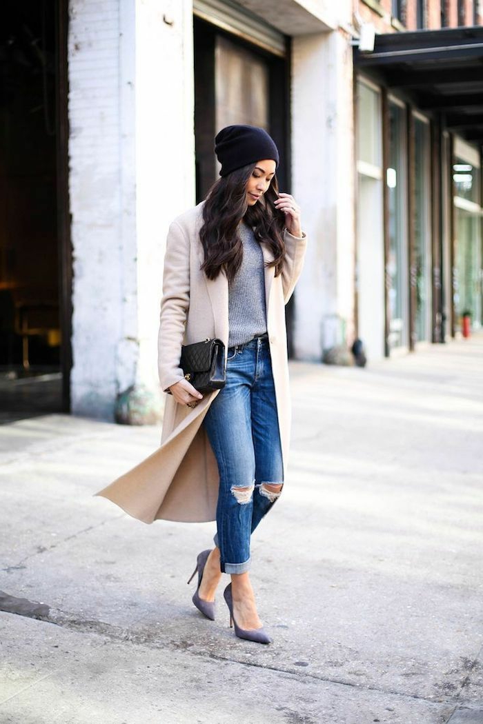 schwarze sneakers schwarze jeans camelfarbener mantel schwarze mini handtasche dresscode sportlich elegante outfits damen 1