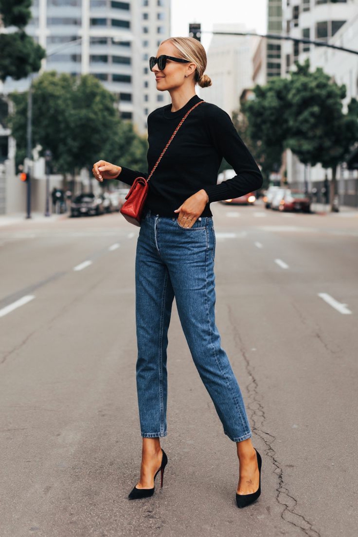 3 dresscode legere jeans zu schwarze spitze High Heels schwarzes Oberteil rote Tasche Sonnenbrillen