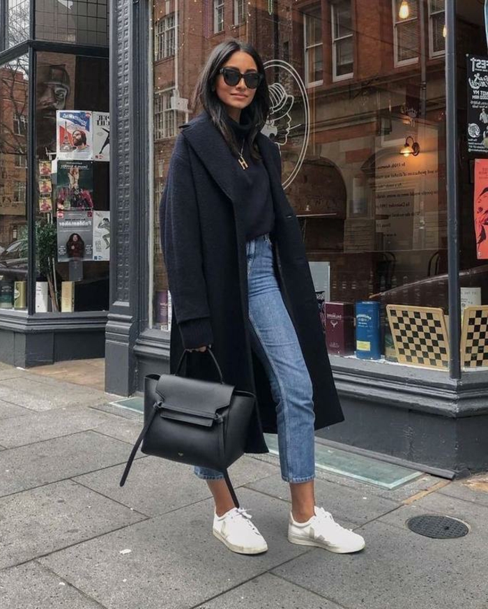 schwarze sneakers schwarze jeans camelfarbener mantel schwarze mini handtasche dresscode sportlich elegante outfits damen 1