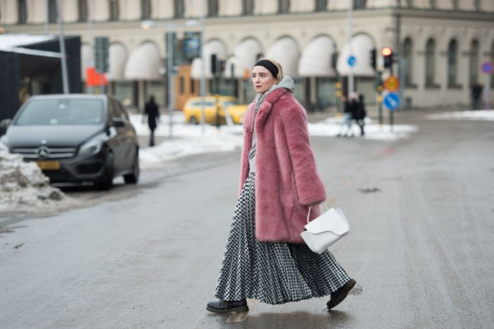 Dänische kindermode eine frau geht auf die straße flauschiger mantel rosarot