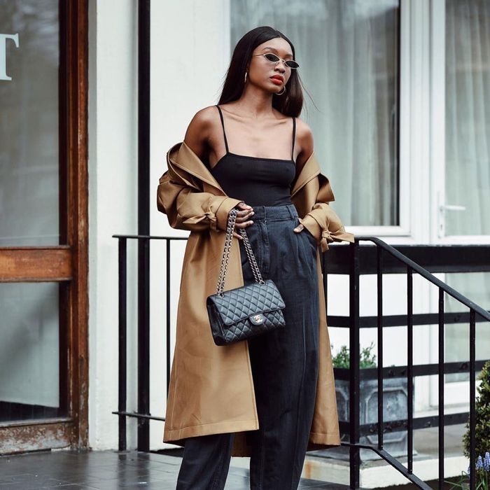 Französische mode online shops schwarzes kleid mit beigem blazer eine schöne model
