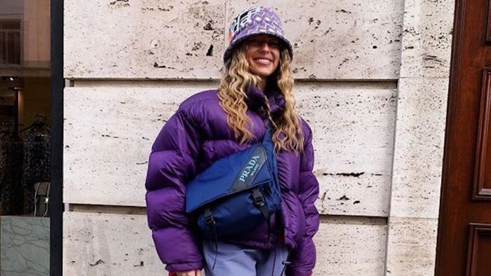 Schwedischer onlineshop mode eine frau mit kreativem casual outfit blaue jacke hut