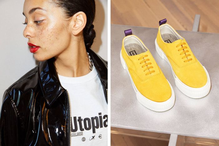 Schwedischer onlineshop mode gelbe krasse sneakers mit einfacher kleidung weißes tshirt uns schwarzer blazer