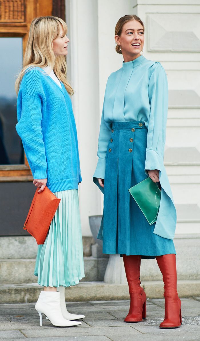 Skandinavische kindermode zwei frauen in blauen outfits kleidung ideen rote schuhe