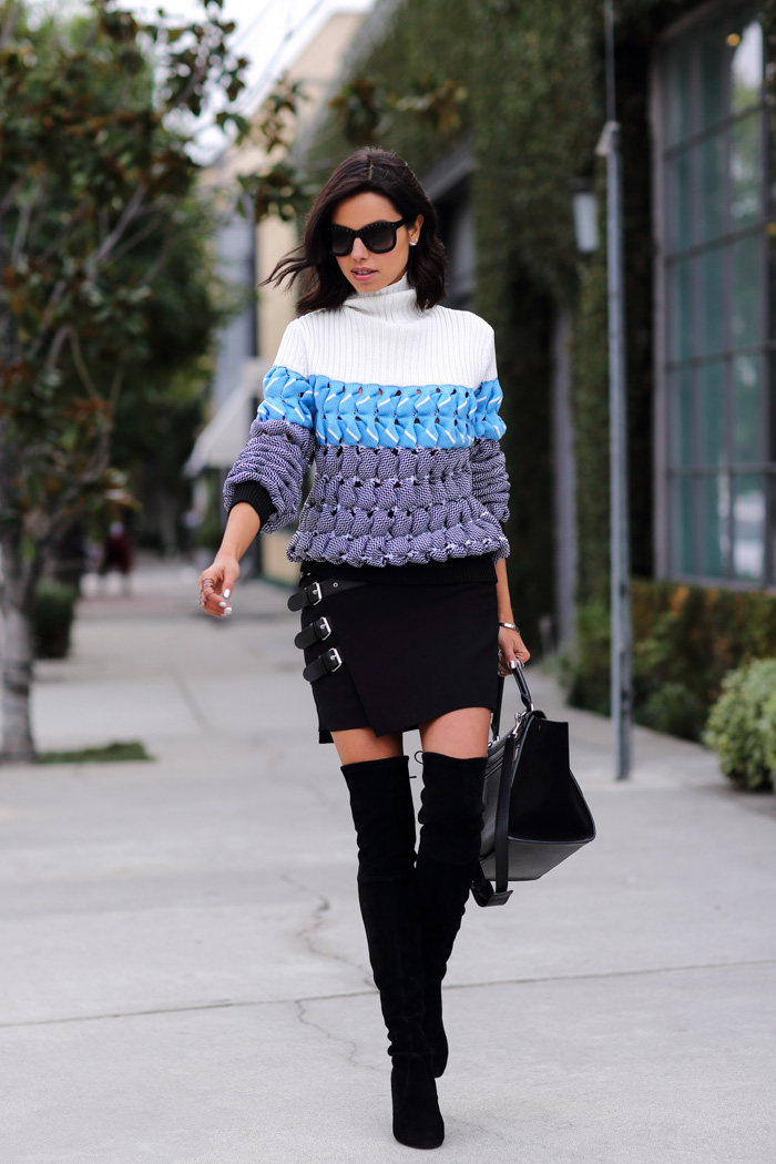 5 winter outfit damen schwarzer rock gestrickte bluse in weiß blau und grau sonnenbrille schulterlange haare lange bob frisur lob