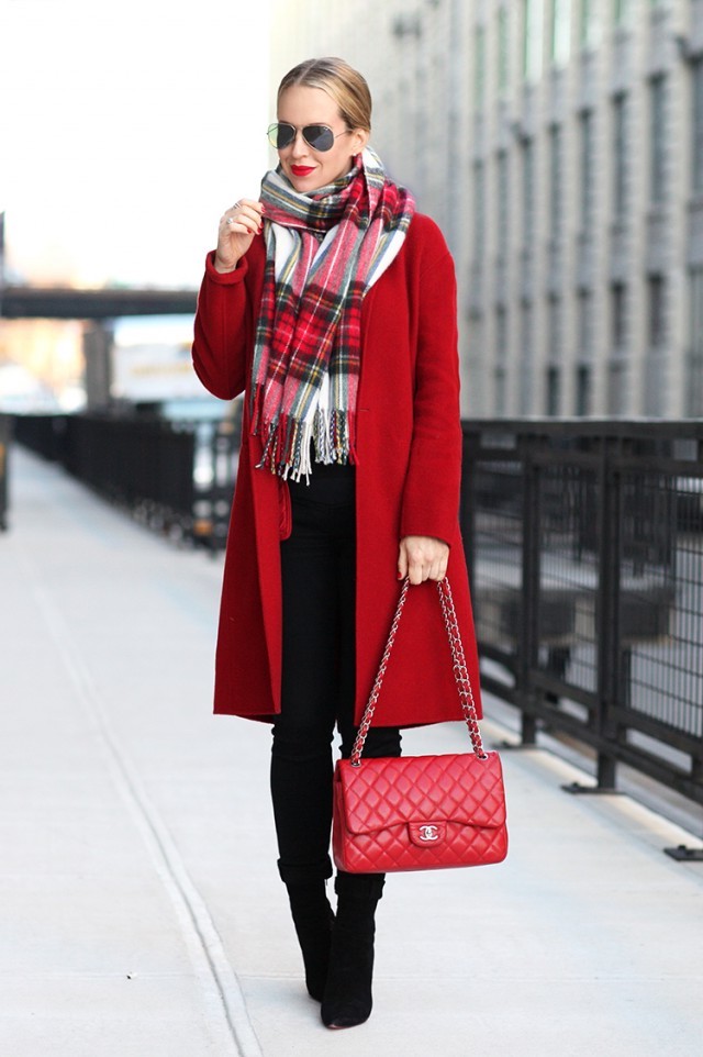 Büro outfit frauen roter mantel rote tasche aus leder karrierter schal sonnenbrille schwarze hose damenmode