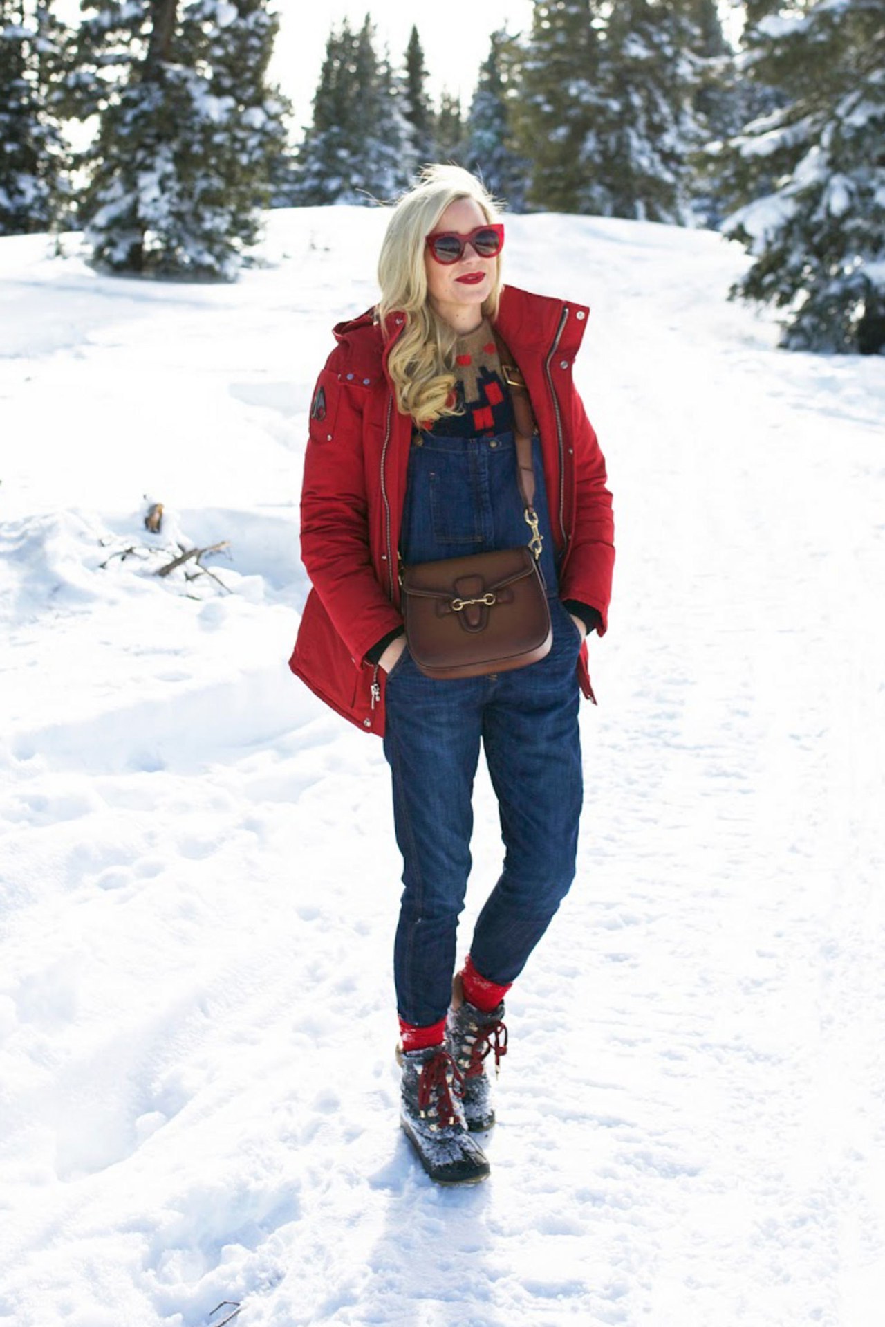 Komplette outfits rote winterjacke sonnenbrille schnee schie fahren frisur mit locken