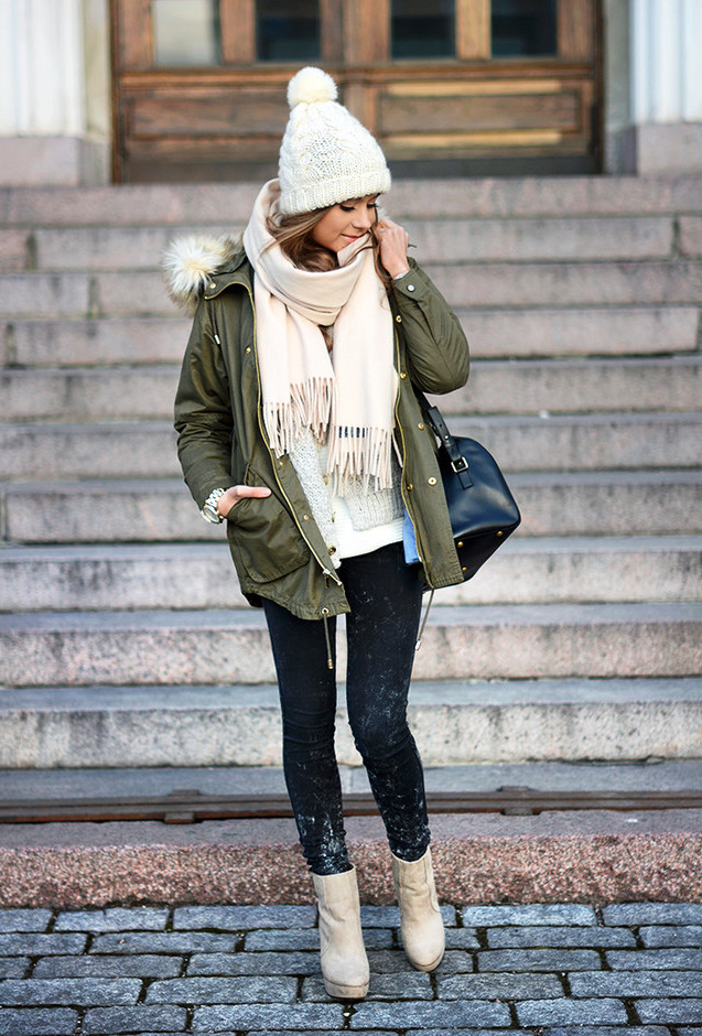 Neuste modetrends dunkelgrüne winterjacke mit fell beige schal alltagsoutfit frau