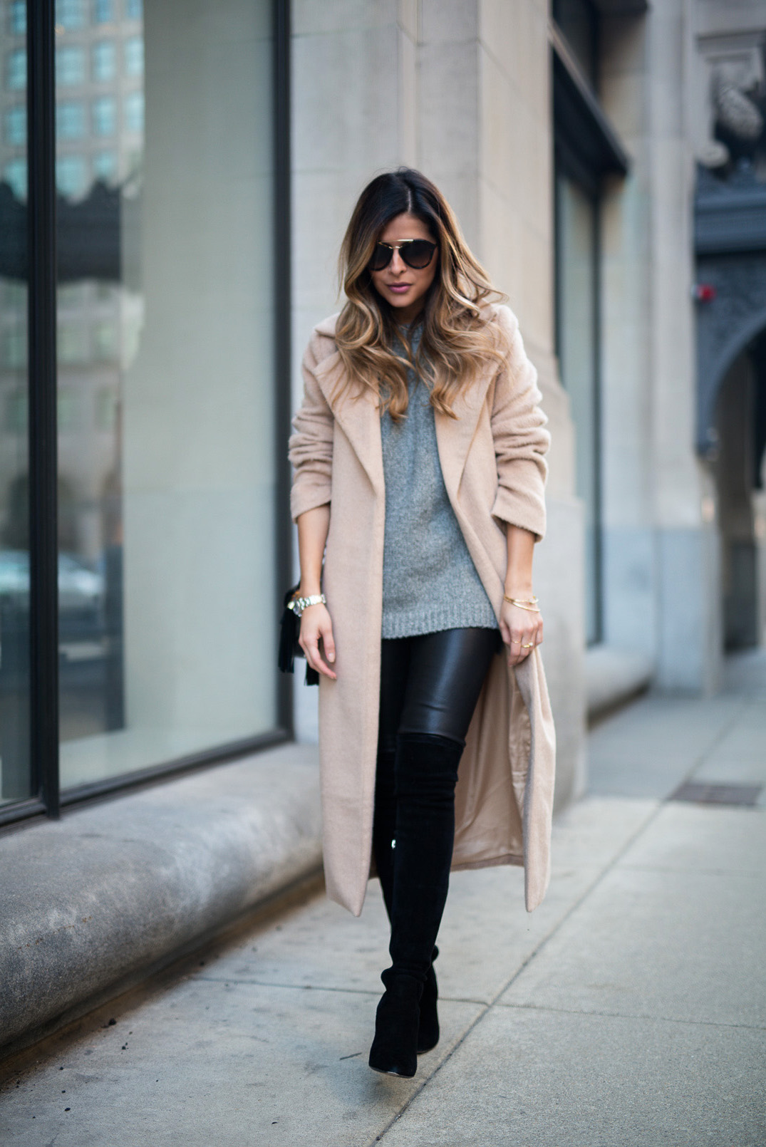 Schickes outfit graue getrickte bluse beige mantel leggings schwarze lange stiefel sonnenbrille frauenmode tendenzen haare im ombre look