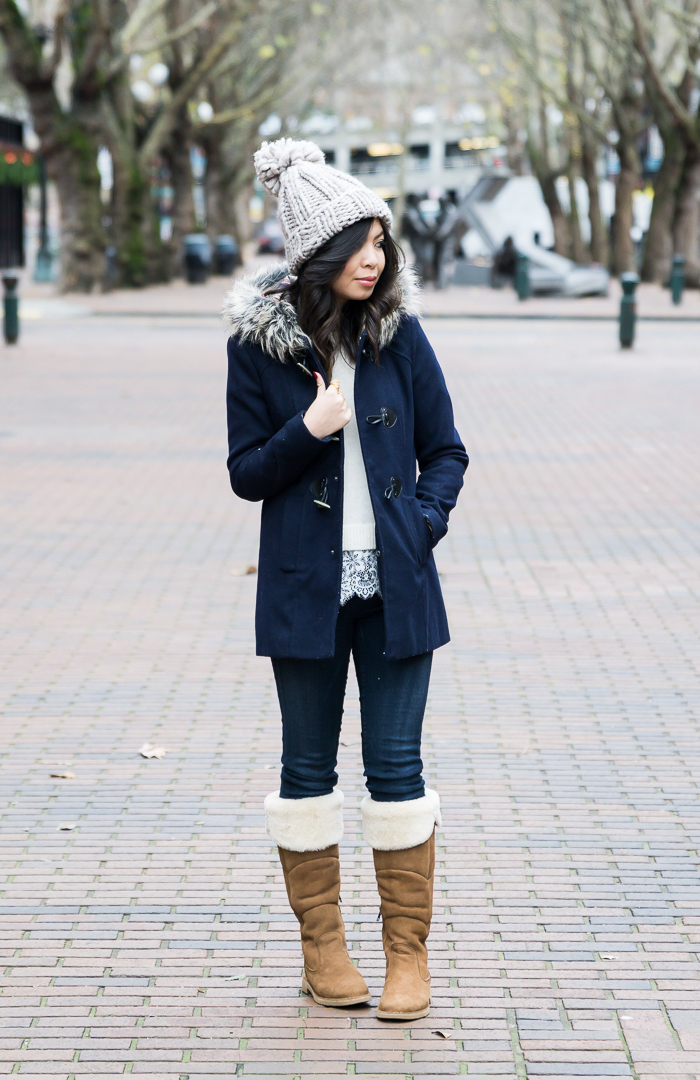 Schuhtrends herbst winter 2017 18 braune stiefel jeans dunkelbraune winterjacke graue getrickte mütze alltagsoutfit frau
