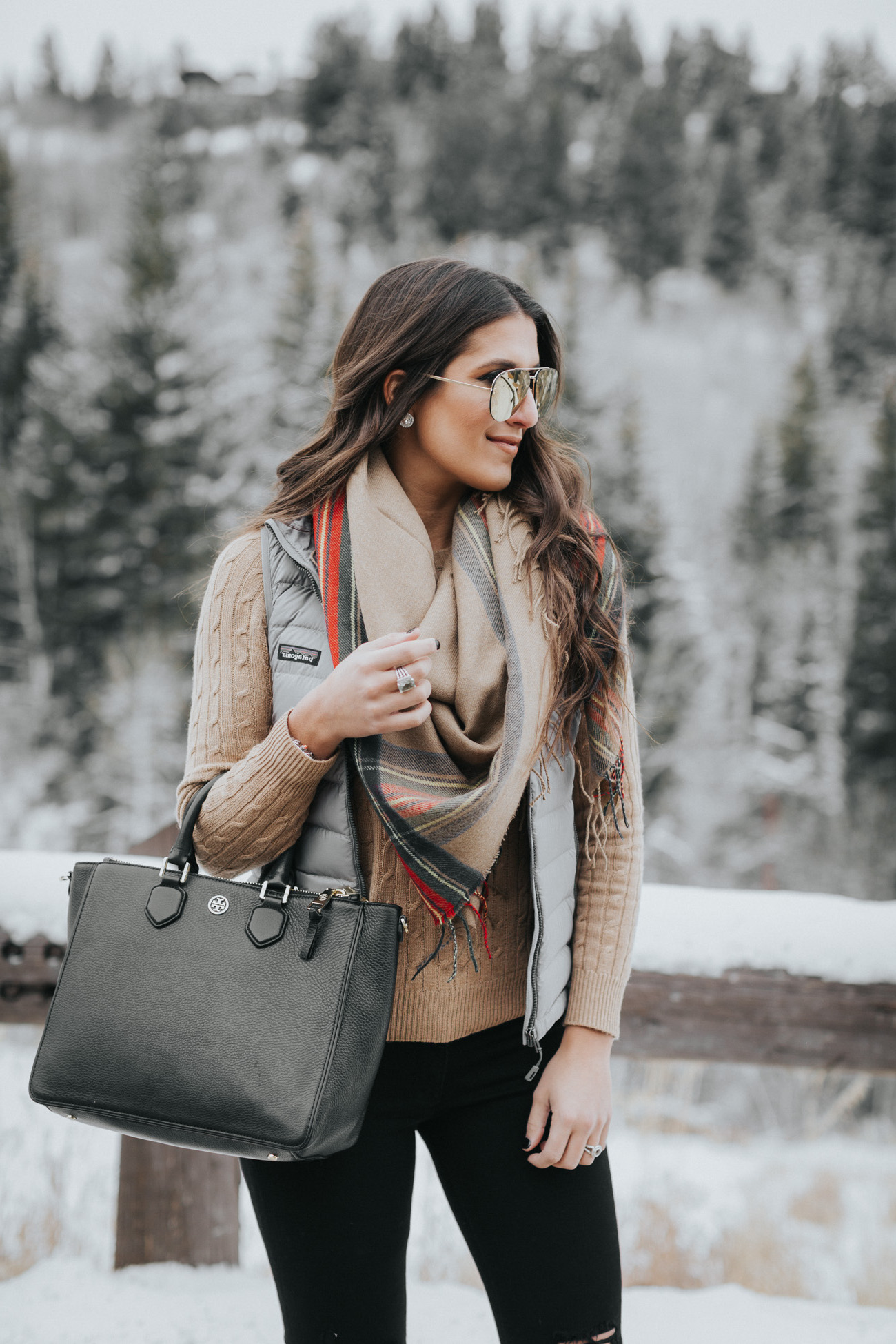 Strickkleider herbst 2017 beige getrickte bluse in kombination mit krarierter shal und grauer weste spiegelbrille