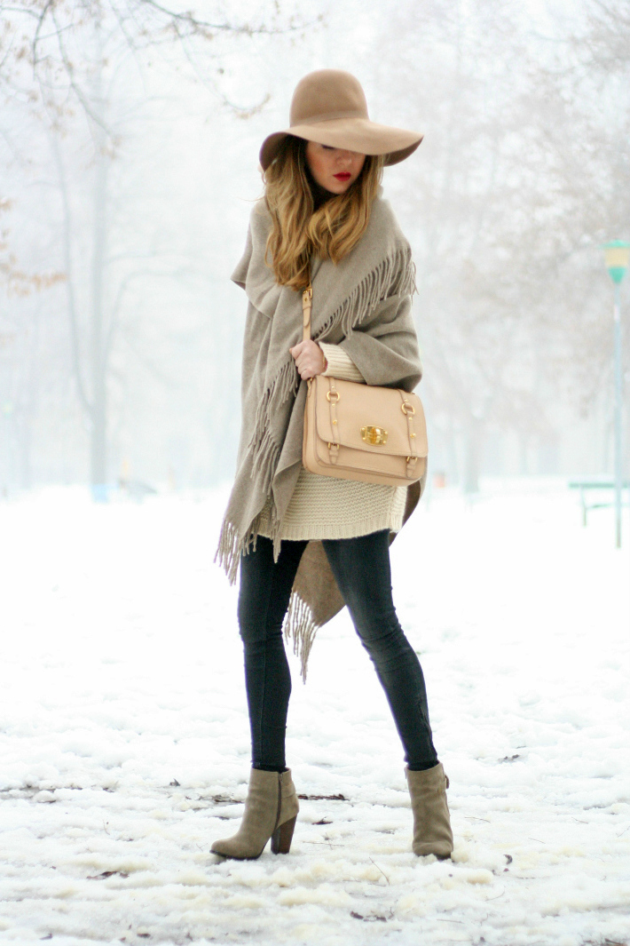 Strickkleider herbst 2017 beige schal hellbrauner hut gestricktes kleid creme tasche hohe schuhe frauenmode