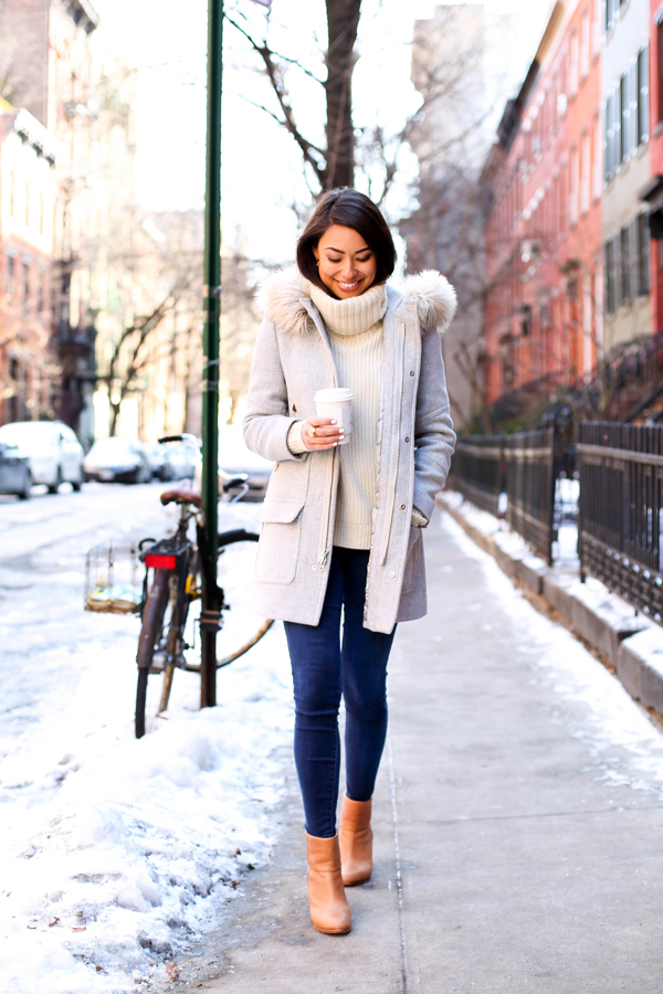 Strickkleider herbst 2017 hellbeige pulli weiße winterjacke mit fell jeans braune hohe schuhe trendiges styling frauen