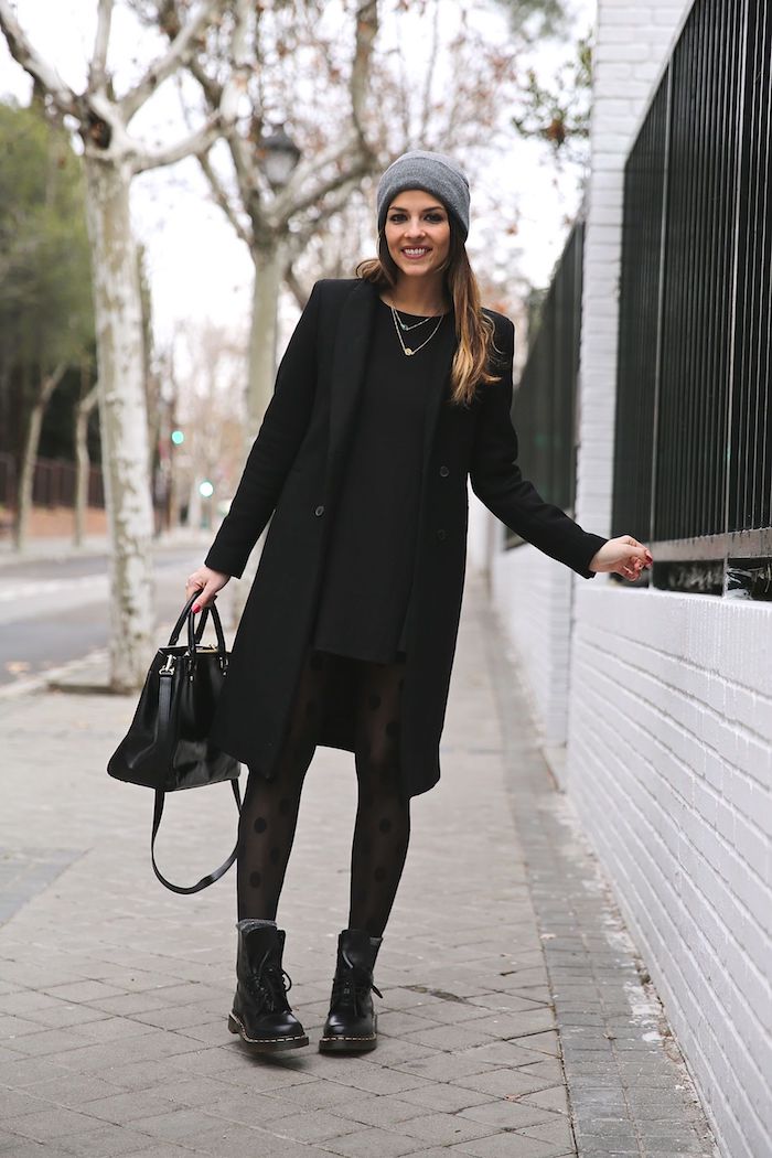 Coole kleider schwarze schuhe alltagsoutfit in schwarz etuikleid kleid graue mütze