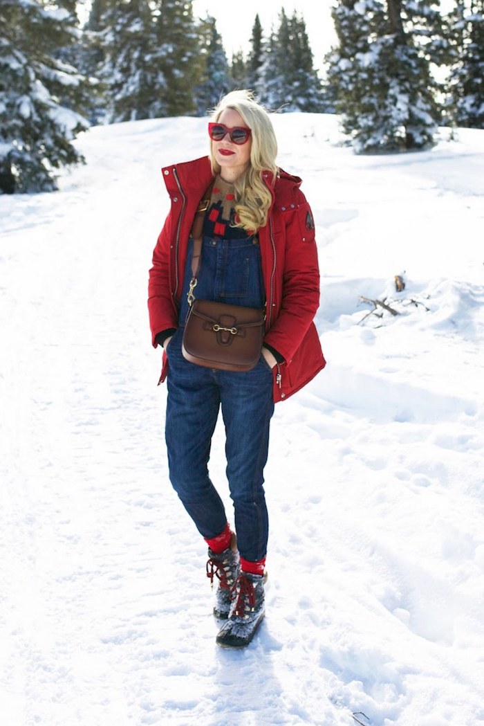 Komplette outfits rote winterjacke sonnenbrille schnee schie fahren frisur mit locken