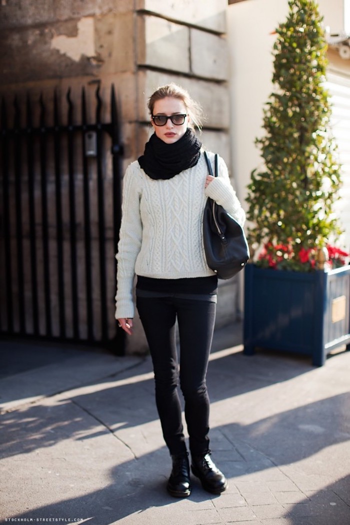Komplette outfits schwarze hose gestrickte weiße bluse alltags outfit frauen