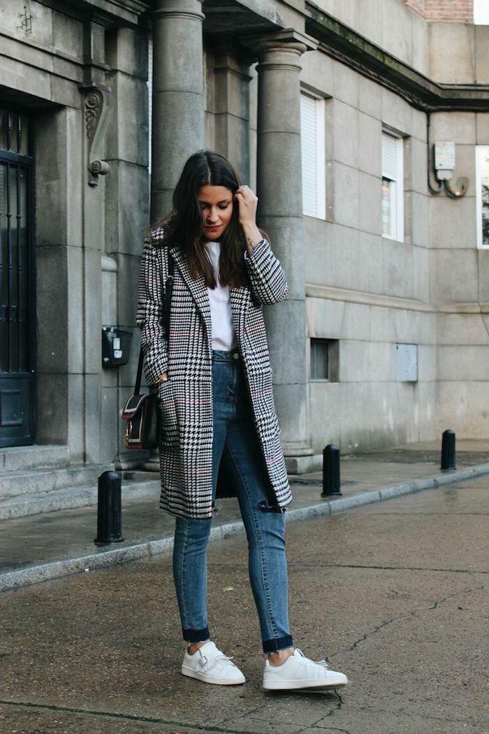 Neueste modetrends sportlich eleganter alltags look karierter mantel jeans sportschuhe