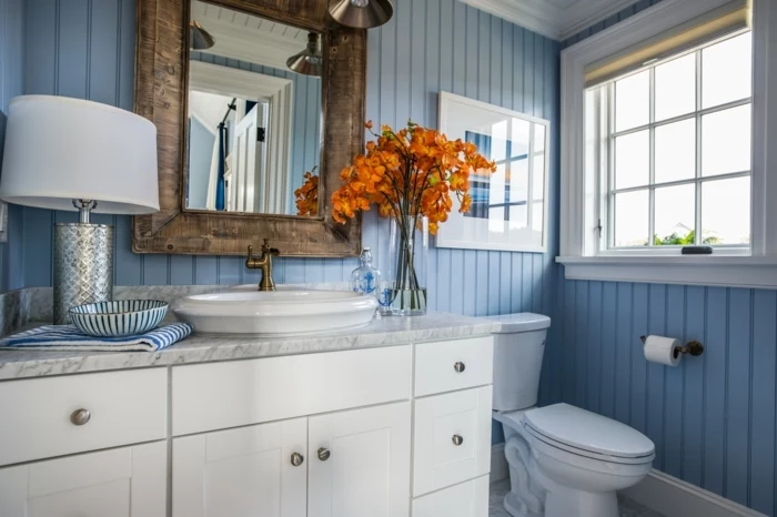 blaues-Badezimmer-Interieur-schöne-orange-Blumen