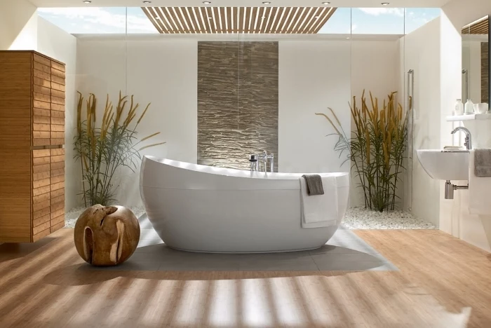 Holen Sie sich die Natur ins Bad! Der Trend „Biophilic Design“ nutzt natürliche Elemente, um eine beruhigende Atmosphäre zu schaffen. Denken Sie an einen Waschtisch aus massivem Eichenholz, Fliesen in Natursteinoptik oder sogar eine kleine Wand mit feuchtigkeitsliebenden Pflanzen wie Farnen. Selbst kleine Akzente wie ein Bambus-Hocker oder ein paar Eukalyptuszweige in einer Vase verwandeln das Bad in eine persönliche Wohlfühloase.