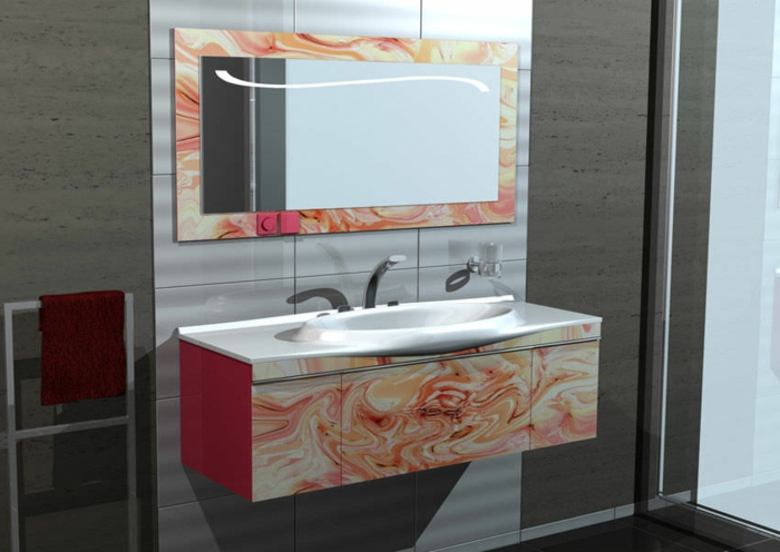 Handwaschbecken bad unterschrank print metallgriffe wandspiegel designer rahmen granitwand graue wandfliesen