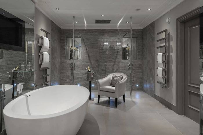 Bäder ideen silberner armstuhl dekokissen zwei duschen tuchaufwärmer sekt sektflasche eisschüssel spiegelwand