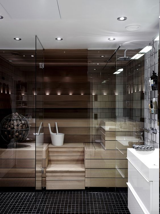 Badezimmer gestalten duschkabine glas regenbogendusche dekoratives licht sauna dampfkessel badregale tuch musterstoff