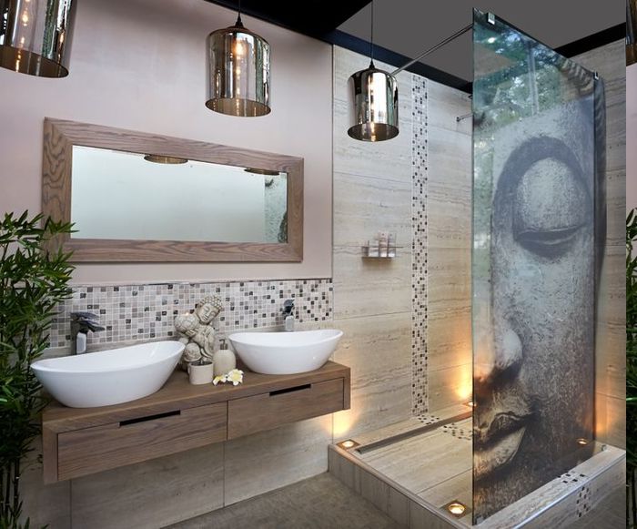 Badgestaltung glaswand buddha print buddha statue waschtisch zwei becken mosaikfliesen industrial kronleuchter led beleuchtung
