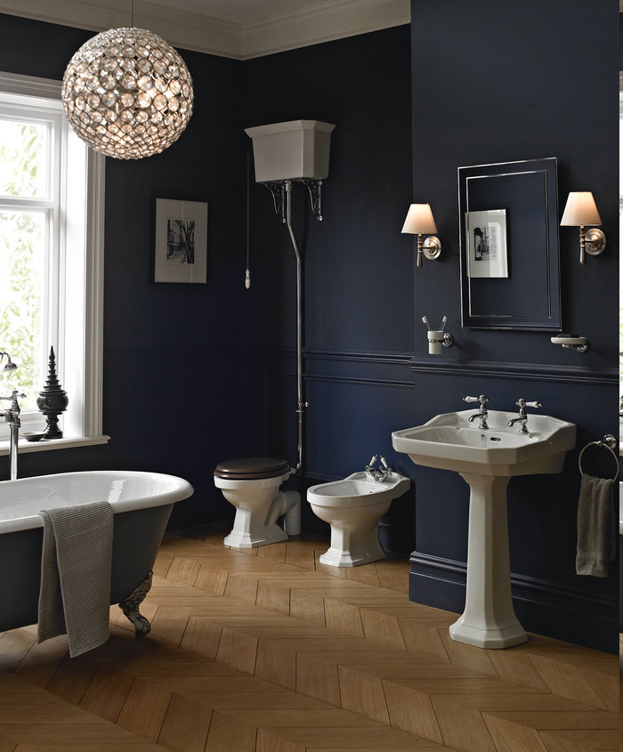 Badgestaltung schwarz weiß schwarze wand vintage badevanne dekoartikel metall runder kristallkronleuchter parkettboden wandlampen bidet