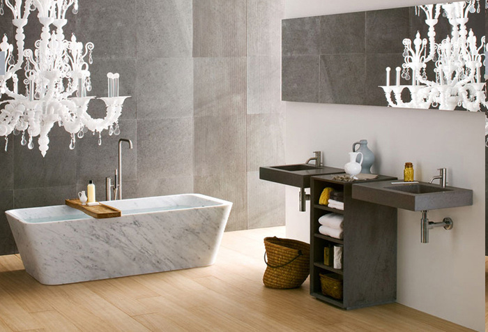 Bad ideen antiker kronleuchter marmorvanne holzbrett schampoo holzregale dekorative kanne flechtkorb seifenbehälter