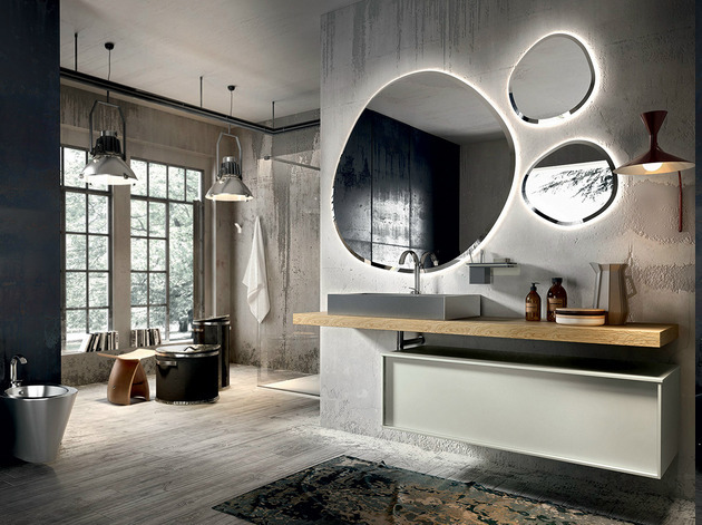 Luxuriöses badezimmer gestalten drei ovale spiegel wäschekiste deckel holzhocker zwei fenster abstrakter teppich