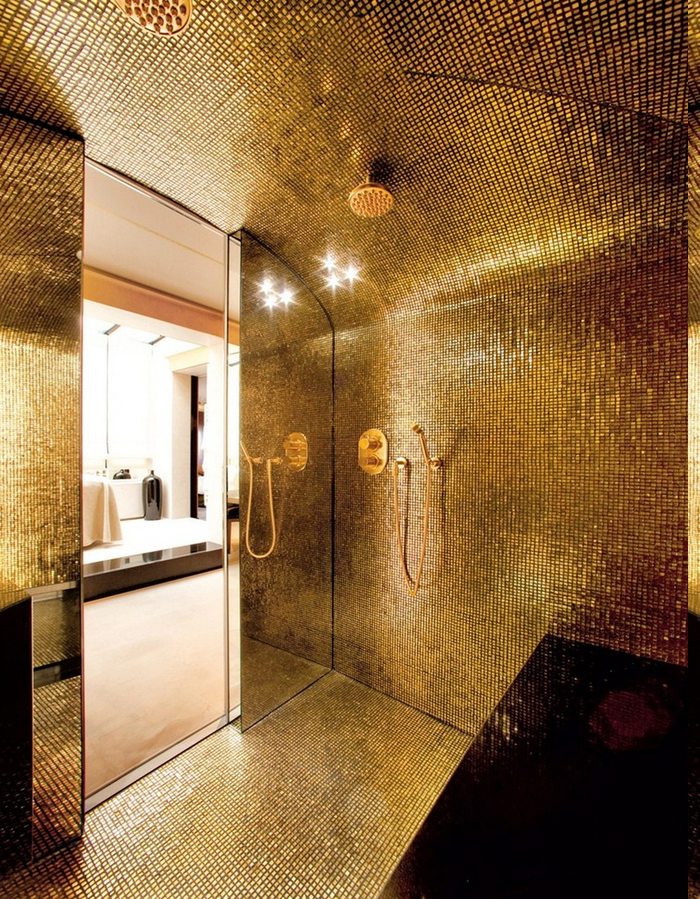 Luxus baddesign duschbereich sauna saunabereich wasserröhre kupferabzug runde fliesen goldüberzug duschraum