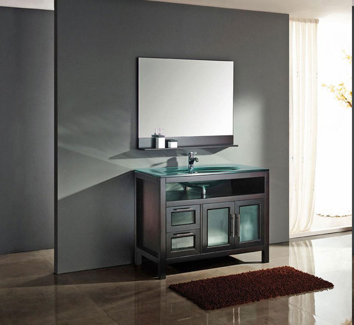 Moderne badeinrichtung glasbecken unterschrank glas tür standardgriff graue wand rote matte natürliches licht naturlicht