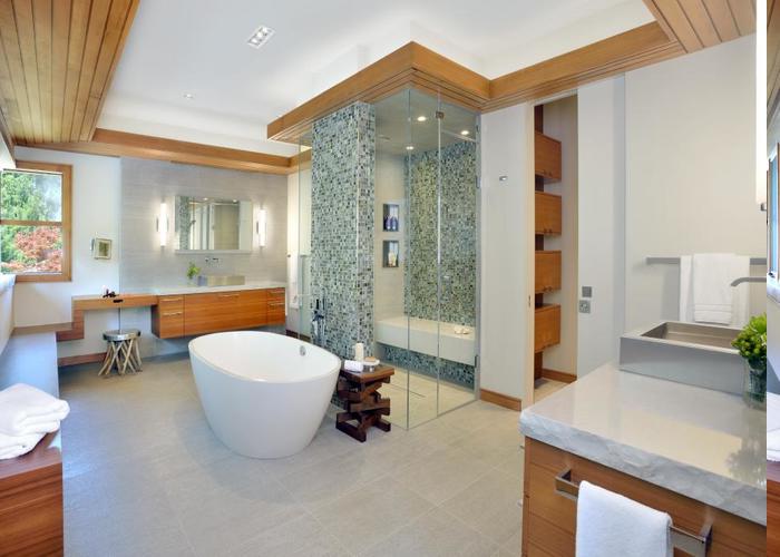Moderne bäder mosaikfliesen nischen beistelltisch modern hocker holzbeine metallsitz decke holzverkleidung indirektes licht