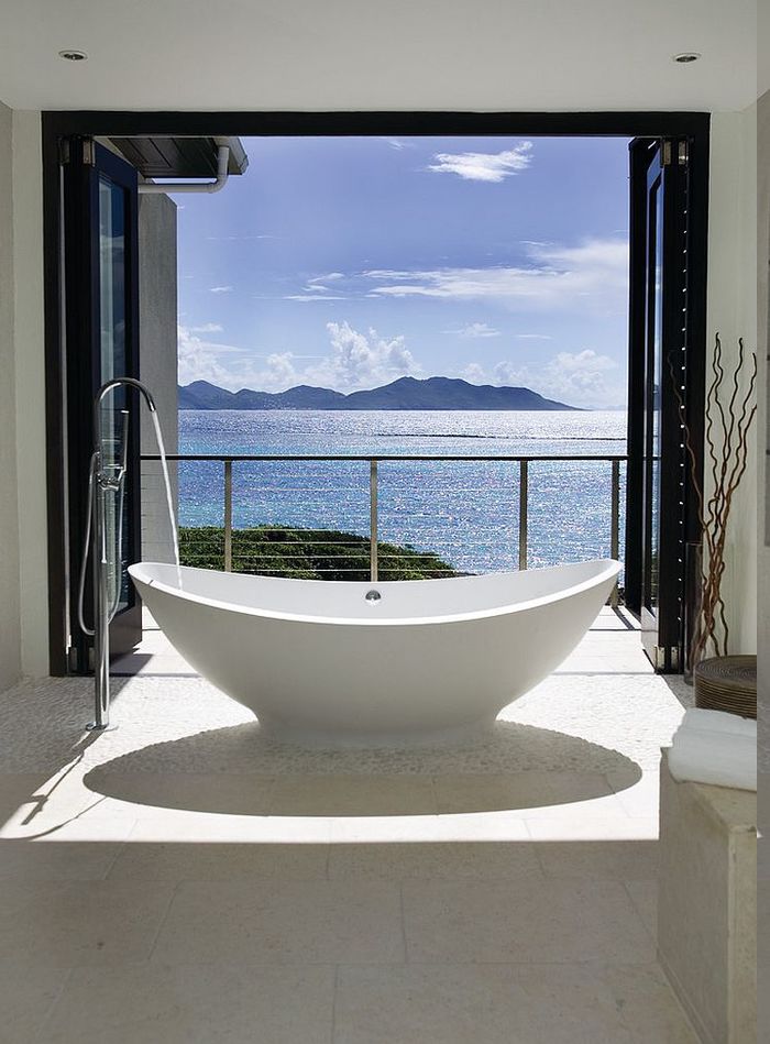 Moderne bäder terrasse glasgeländer zweiflügelige tür ikebana flechtkorb wöschekorb meeresaussicht gebirge meer