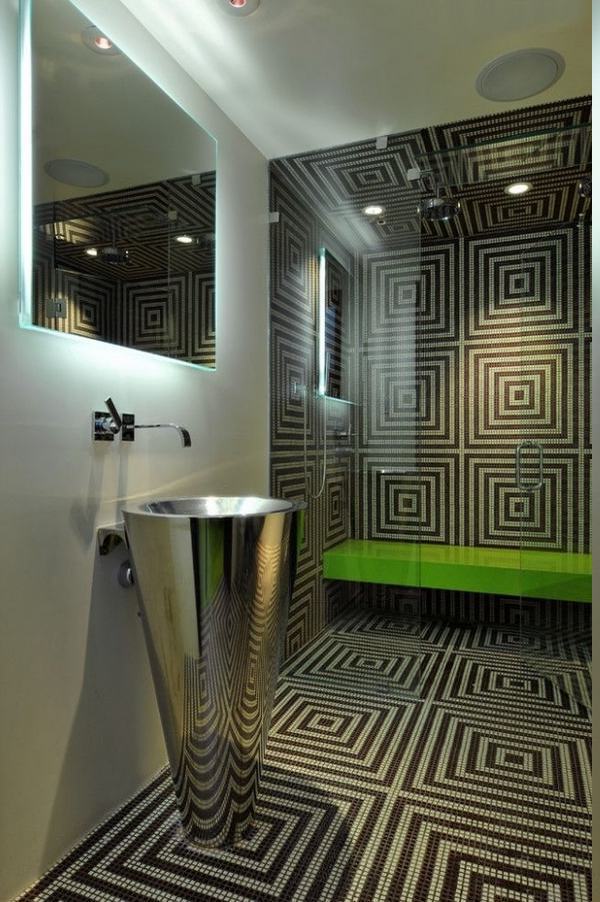 3 d baddesign badfliesen 3 d effekt freistehendes metallbecken spiegel ohne rahmen grüne sitzbank duschbank