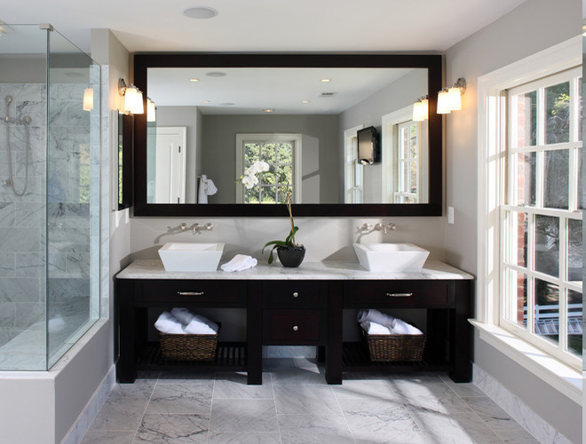 Bäder ideen duschkabine glas doppelbecken schwarzer unterschrank großer spiegel massivrahmen wandlape badfenster