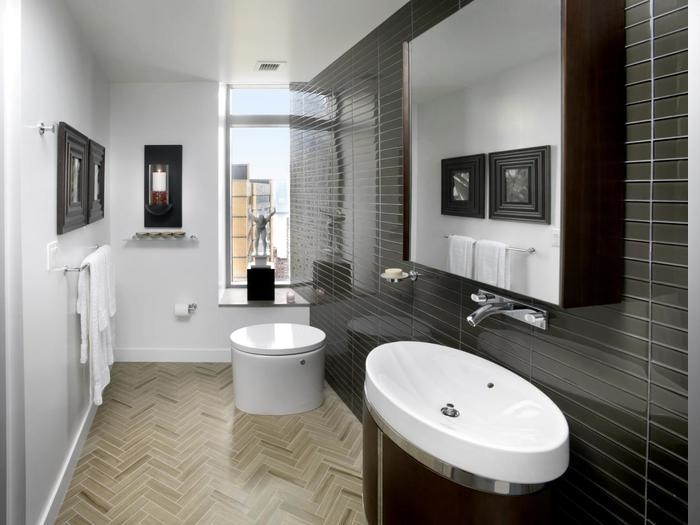 Badezimmer ideen glanzfliesen braun wanddeko kerzenhalter wandmontage ovales becken boden parkettoptik