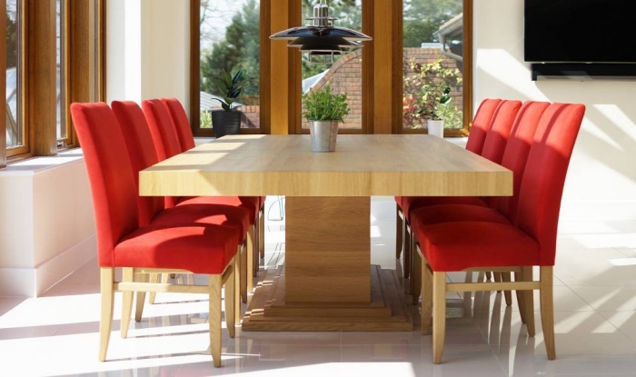Esstisch auswählen massivholztisch aus eiche esszimmer einrichten ideen rote stühle esszimmereinrichtung