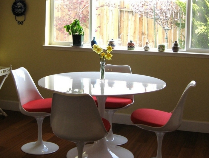 Ungewöhnliches Modell Esszimer weiß rund gelbe Blumen Designer Stühle rote Polster