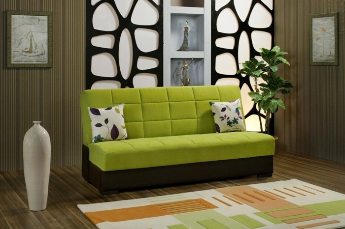 2farbgestaltung wohnzimmer gruene couch bunter teppich holzboden dekorative vase dekorative wandnischen pflanze kissen mit musterbezug