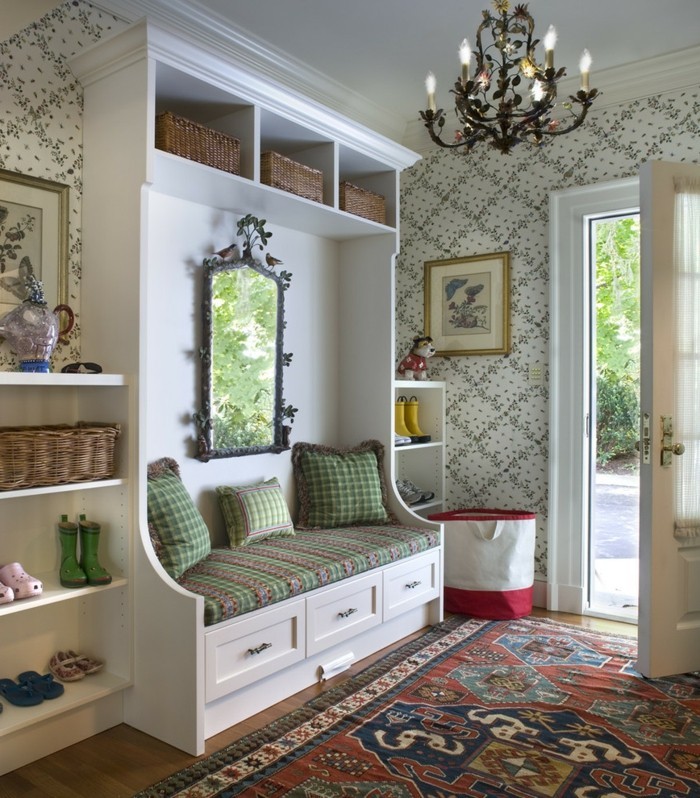 Flur ideen ein perserteppich bequeme sitzbank und großer spiegel resized