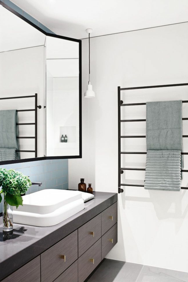 Schwarzer heizender Handtuchhalter im Badezimmer