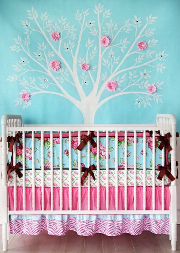 Kreatives modell babybettchen bemalter baum an der blauen wand