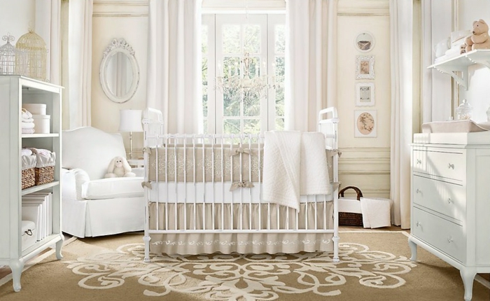 Babyzimmer ideen neutrale farben pluschteppich beige florale motive weiß gestaltet weiße einrichtung