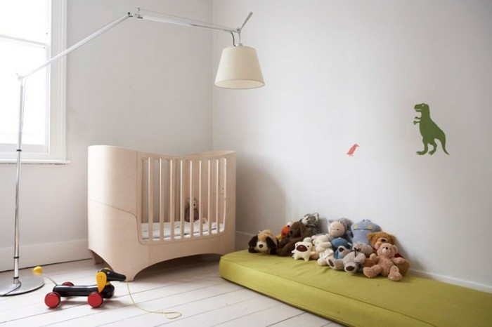 Babyzimmer ideen simple einrichtung helle wände grüner sofa wansticker dinosaurier stehlampe